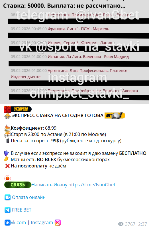 Без регистрации в определенной конторе доступ к его выигрышным стратегиям якобы будет закрыт. Платные экспрессы продаются по цене 99$ за один купон с заоблачным коэффициентом. При проигрыше ставки @IvanGbet обещает предоставить следующую замену совершенно бесплатно.