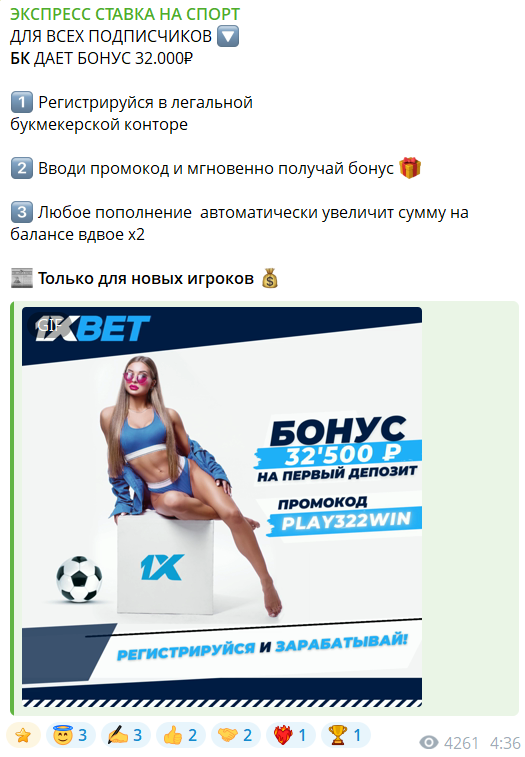 Каппер активно предлагает подписчикам бесплатные прогнозы и платные экспрессы с огромными коэффициентами. В ленте нам постоянно предлагают получить бонус 32 000 рублей от партнерских букмекерских контор. Чтобы получить такой, пользователю нужно пройти регистрацию по специальной ссылке. Админ канала также активно предлагает использовать его промокоды на разных сайтах.