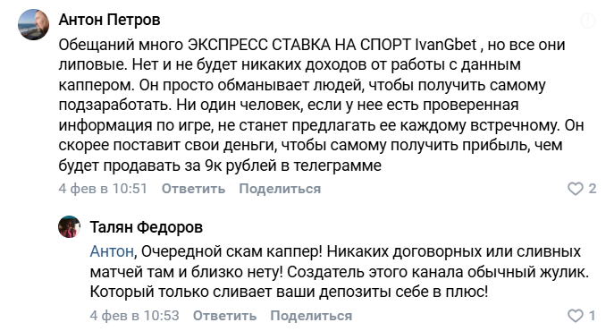 Если вы уже потеряли деньги из-за советов @IvanGbet, напишите об этом нам. Оставьте отзыв или жалобу на сайте, чтобы предупредить остальных людей об опасности от этого каппера.