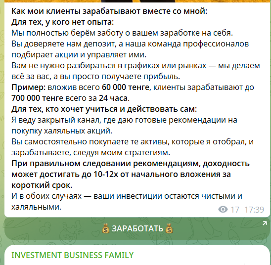 Наши эксперты узнали больше о телеграм канале “INVESTMENT BUSINESS FAMILY”. Может показаться, что его основатель стремится помочь подписчикам заработать. На деле же он единственный, кто остается от такого сотрудничества в плюсе.