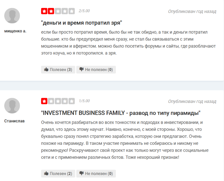 В ходе проверки стало ясно, что на канале “INVESTMENT BUSINESS FAMILY” деньги можно только потерять. Основатель не имеет никакого отношения к трейдингу, но это не мешает ему обманывать подписчиков. За обещаниями заработка скрывается вытягивание средств, не приводящее к результату. Большое количество людей уже пострадало от его деятельности, сформировав тем самым неблагоприятную репутацию.