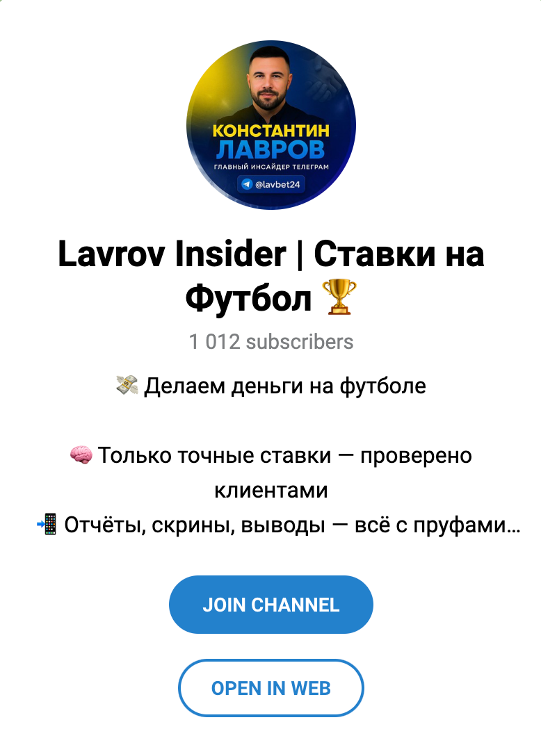 Константин Лавров ведет канал, где делится успешными прогнозами и предстоящими договорняками. На канал подписано более тысячи человек, но нельзя не заметить – у него нет публичной ссылки. Это может говорить как позитивно – что автору не нужна широкая аудитория, так и отрицательно. Ведь если нет публичной ссылки – то значит аудитория туда приходит только из-за рекламы, без рекомендаций подписчиков. Это явно не способствует популярности и заработку Константина Лаврова. В качестве одобрения вступления используется бот @LavrovStavkiBot.