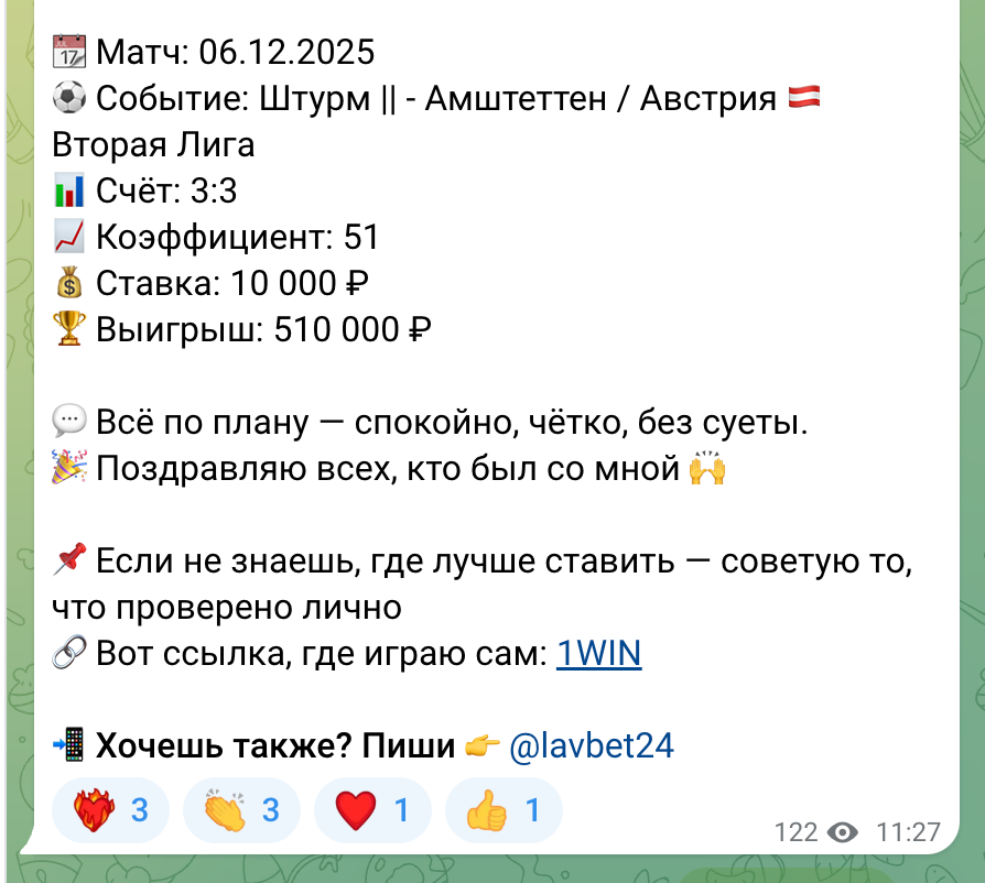 На канале постоянно публикуются успешные ставки от Константина Лаврова и его рекомендации. Они все выглядят очень амбициозно: огромный коэффициент и приличный выигрыш. При этом достаточно относительно смешной суммы. Например в одном из постов автору понадобилось всего лишь 10 тысяч рублей, чтобы получить более полумиллиона! Это выглядит очень привлекательно, и чтобы узнать подробности, нужно написать в личные сообщения Константину.