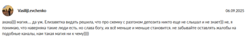 На просторах интернета полно сообществ с подобными предложениями заработка. Но большая их часть создана мошенниками и данный проект не стал исключением. Елизавета не раскручивает депозиты подписчиков, а, напротив, уменьшает их суммы. Ведь при сотрудничестве с мошенницей потребуется оплатить множество разных услуг. Например, Елизавета может потребовать оплатить налог от прибыли, выполнив перевод на ее счет. Если инвестор выполнит условие, то Елизавета потребует оплатить комиссию перевода прибыли с биржи. Далее мошенница может потребовать оплату страховки депозита и других услуг. Очевидно, что Елизавета выдумала каждую услугу. Ведь именно оплата выдуманных услуг приносит мошеннице больший “Заработок” от сотрудничества с подписчиками. И как только подписчики почуют развод, Елизавета занесет их в черный список канала.