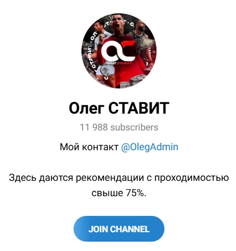 Перед Вами проект, где предоставляются рекомендации по ставкам с проходимостью более 75%. На проект подписано почти 12 тысяч человек. Хотя не стоит акцентировать внимание на число аудитории. Ведь капперы часто накручивают аудиторию. Владельцем сообщества является некий Олег @OlegAdmin. Данный мужчина не сообщает о своем стаже в ставках и не показывает лицо. На телеграмм канале Олег предлагает совершать ставки на футбол по прогнозам. Он предлагает как платные, так и бесплатные услуги.