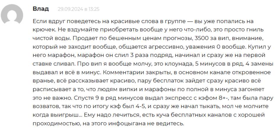 Обзор помог понять, что спортивная аналитика с канала “Олег ставит” приносит деньги только основателю. Олег явно не является профессиональным аналитиком, которому стоило бы доверять. Ведь он не ведет реальную статистику проходимости аналитики. Кроме того, каппер не дает подробное описание предстоящих событий. А на просторах интернета ставочники только жалуются на прогнозы и экспрессы Олега.