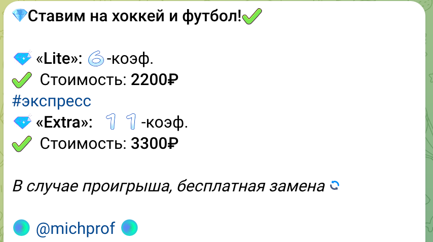 На канале публикуются как бесплатные ставки, так и платные экспрессы. Бесплатные ставки достаточно стандартные – с коэффициентом ниже 2. Они очень часто выигрывают, чем привлекают пользователей на канал. А вот платные экспрессы уже гораздо интереснее. Нам предлагается два варианта: с коэффициентом 6 и 11 по цене 2200 и 3300 рублей. Это отличная сделка, которая однозначно привлекает пользователей. В случае же проигрыша ставки, каппер делает бесплатную замену на следующий прогноз.