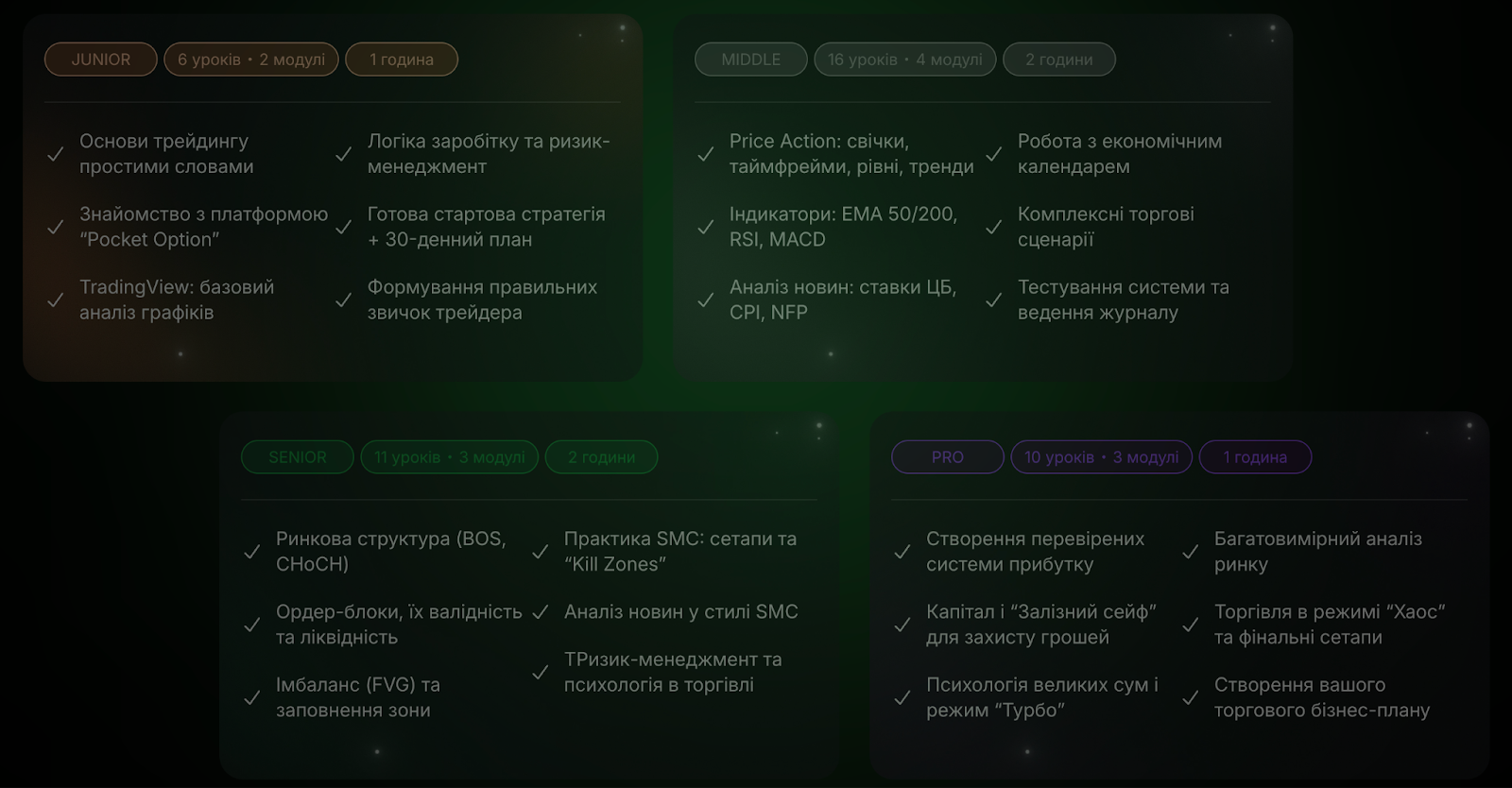 Кроме торговых сессий, автор канала предлагает обучение по трейдингу. Есть несколько планов для различных уровней. Но подробностей цены мы не увидели. Чтобы перейти к ним, необходимо зарегистрироваться по реферальной ссылке у брокера, и отправить свои данные.