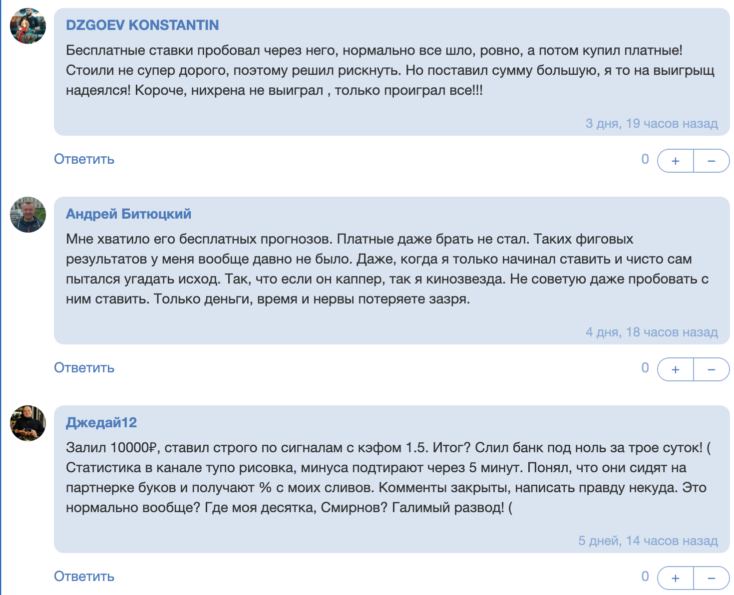 Выполнив разбор проекта “Стратегия Смирнова”, мы нашли неприятные детали. Данный проект создан хитрым каппером новичком, для собственного заработка. Автор совершенно не проводит анализы матчей, а лишь выбирает слабые коэффициенты. Ординары, которые много заходят, он использует в качестве бесплатных прогнозов для приманки. Экспрессы из подобных матчей он продает, создавая иллюзию хорошего коэффициента. Но процент сливов уже гораздо больше, и пользователи теряют свои деньги. Никите же это совершенно не интересно, ведь свои деньги за прогноз он уже получил.